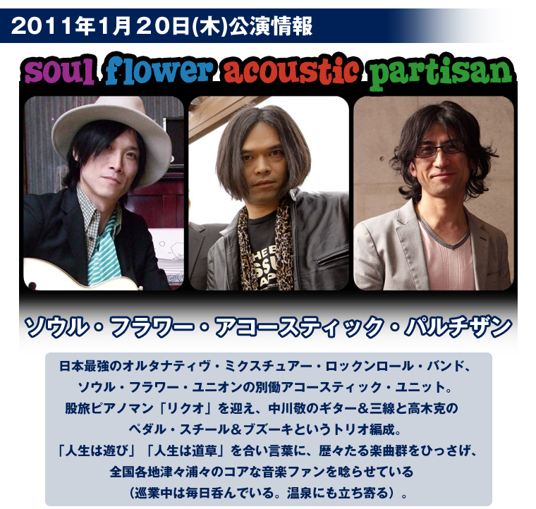 - ※1月20日(木)開催「ソウル・フラワー・アコースティック・パルチザン」公演の当日券は17時00分から販売致します。