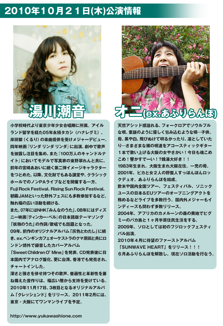 天然アシッド感溢れる、フォークロアでソウルフルな唄、童謡のように優しく包み込むような唄・・・子供、母、黒や白、飛びぬけて明るかったり、凛としていたり・・・さまざまな裸の唄達をアコースティックギター一本で歌い上げる大阪の女やさかい!今日も魂こめこめ!響かすでーい!?銭湯大好き!!1983年生まれ。大阪生まれ大阪在住。一児の母。2001年、ピカと女2人の野蛮人すっぽんぽんロックデュオ、あふりらんぽを結成。欧米や国内全国ツアー、フェスティバル、ソニックユースの日本&EUツアーのオープニングアクトを務めるなどライブを多数行う。国内外メジャーもインディーズも問わず多数リリース。2004年、アフリカのカメルーンの森の奥地でピグミーのバカ族と1ヶ月半原住民生活をする。2009年、ソロとしては初のフジロックフェスティバル出演。2010年4月に待望のファーストアルバム「SUNWAVE HEART」をリリース!!!6月あふりらんぽ を解散し、現在 ソロ活動を行なう。トンチ