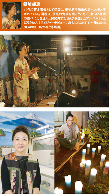 弁天湯が笑っていた。7月6日(木)19時。“ハレの日の慶び”を歌う「今日ぬほこらしゃ」でスタートした「風呂ロックvol.7」には、島の夏祭りに迷い込んだような幻想的な雰囲気がただよっていた。かつてこんな空間を経験したことがあっただろうか。奄美の伝統的な衣装に身を包んだ朝崎さんのステージの華やかさと、会場に集った老若男女約220人の観客の熱気とともに目を惹くのが、キャンドルアーティストCandle JUNE による会場演出だ。美しさと機能性の微妙なバランスで配置された、色とりどり大小様々のキャンドル群は、もともと「神降ろし」の歌が原点とされる島唄のコンセプトを見事に表現している。ステージ上の“聖”と、唄を楽しみ酒を楽しむ我々の“俗”をつないで、ひとつの世界を作り上げている。この場から夏祭りの風景のような感覚を受け取るのも、彼の演出の巧みさによるところが大きいであろう。島唄と人との出会いを大切にする朝崎さんは、一曲一曲の歌について解説を交えてライブを進行する。「ありがとう」の言葉にも魂が込められる。喜びの歌とともに、奄美の島唄には悲しい曲調の歌も多い。直截的な歌詞こそないが、薩摩と琉球の2重支配に苦しんだ島の歴史が生み出した、人々の切実な叫びがそこにある。美しいピアノの旋律と太鼓、そして沖縄のものとは異なり、乾いたせつなげな音色を奏でる三線が、朝崎さんの島唄に色を添える。一曲ごとに時間と空間を超えて、観客は次第々々に島唄の世界に惹き込まれていく。ライブ終盤「豊年節」と「六調」の大カチャーシー大会で歌い踊り、熱気で膨れ上がった会場はついにひとつになる。しかし、何にもまして圧巻なのは、アンコール最後の「故郷」アカペラであった。会場全員による合唱。朝崎さんの歌声に観客ひとりひとりの歌声が重なり、荘厳な響きが生まれる。彼岸の道はひらいたか。その音楽はまるで、彼女の歌にみちびかれニライカナイへと漕ぎ出す魂たちへのレクイエムのようだ。