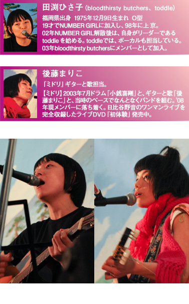演奏が終わった後、壇上には田渕さんと後藤さん。二人によるMCが始まる。二人とも、自分のことを「ぼく」と呼んでしまったり、4人兄弟だったりする共通点が判明していき、女子失格(?)発言も出ながら盛り上がる。最後には、NUMBER GIRLの「透明少女」を二人で歌うという夢のコラボレーションが実現し、興奮のラストを向かえた。再アンコールを求める手拍子に、